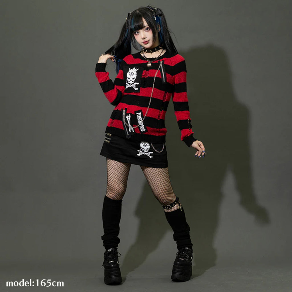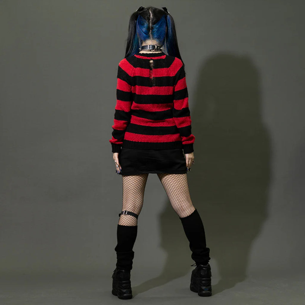This sweater brings back nostalgic punk vibes with its bold stripes, distressed details,