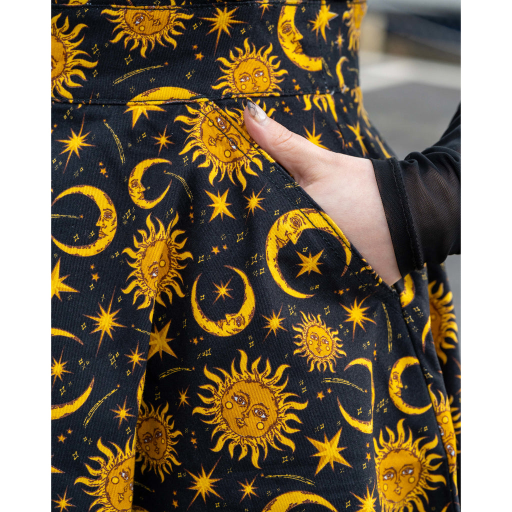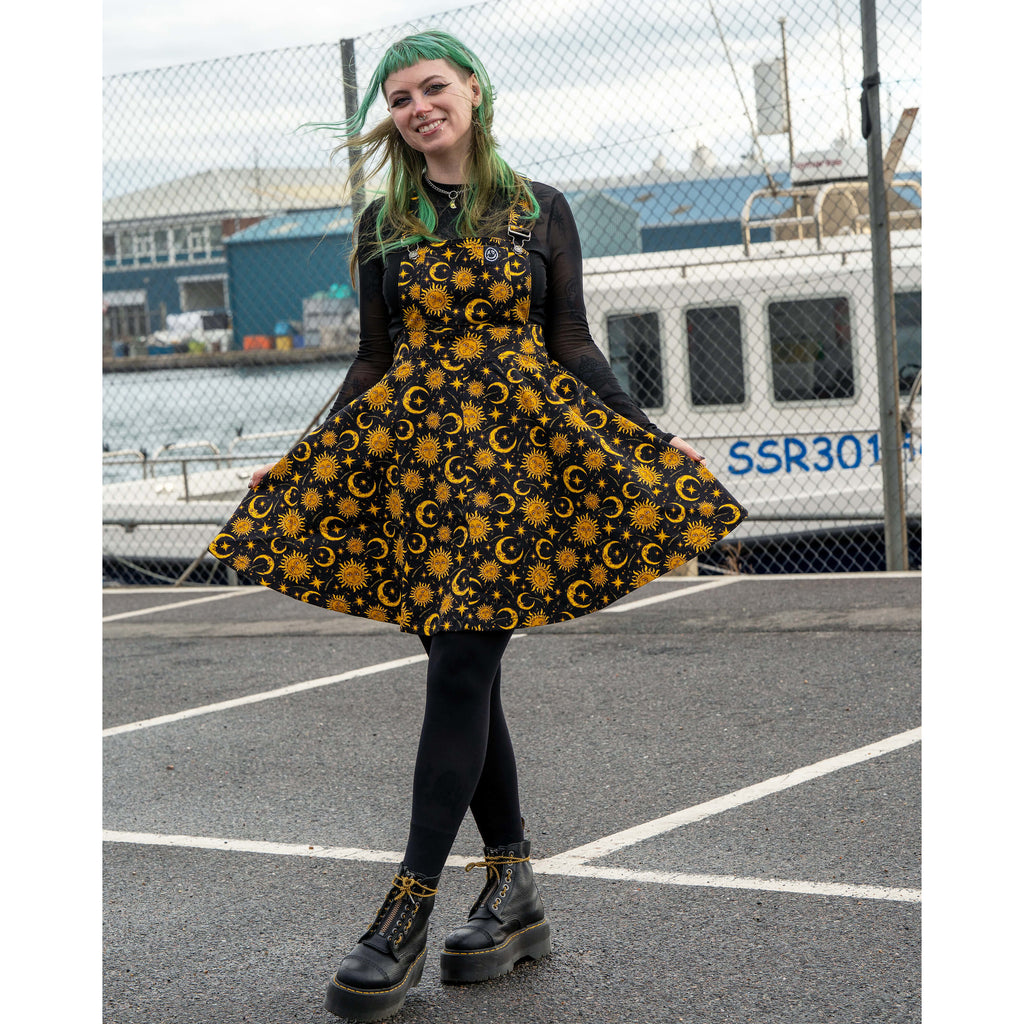 Celestial stargazer pinafore with gorgeous print. Features images of the sun, moon and stars.