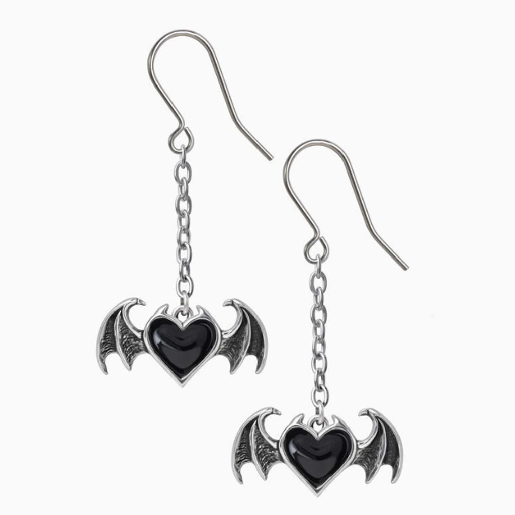 Gothic drop earrings in antiqued pewter, each featuring a black enamelled heart.