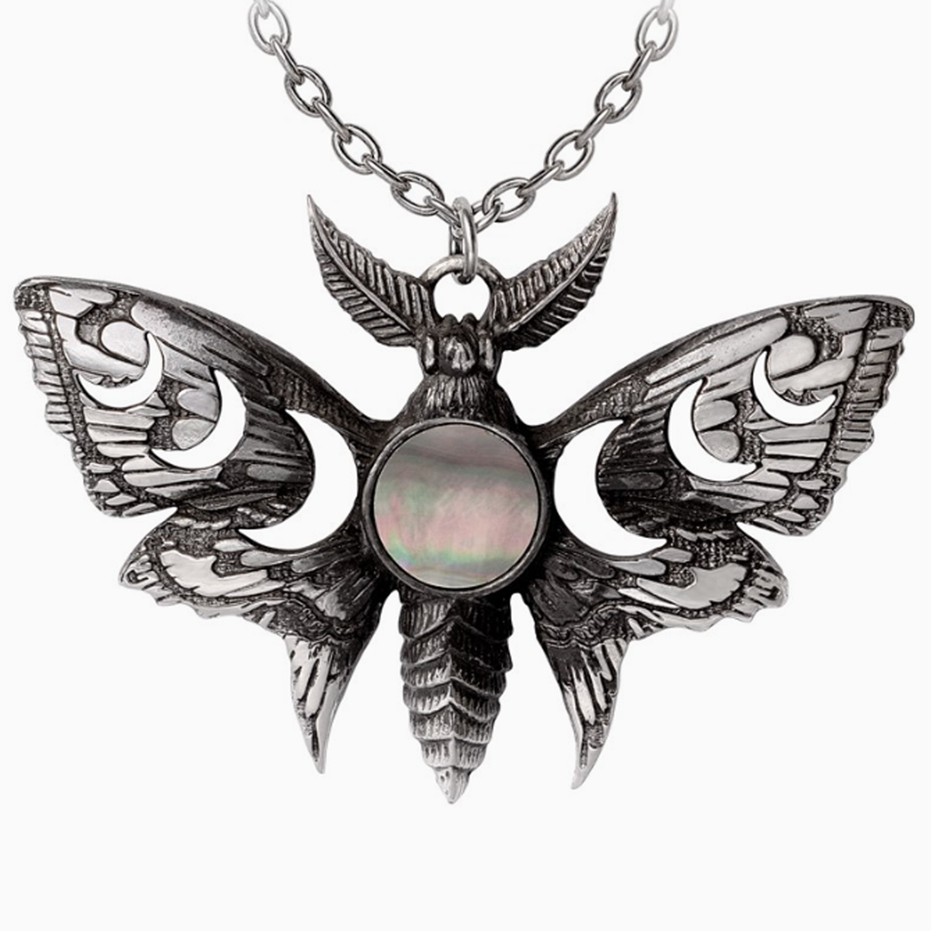 Statement lunar moth necklace in antiqued pewter. An exquisite necklace featuring a grey iridescent mother of pearl disc.