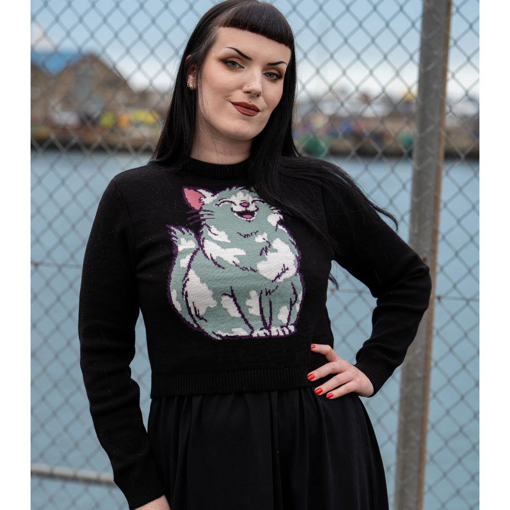 Cute and cosy cropped knit jumper featuring a purrfectly adorable kitty cat!