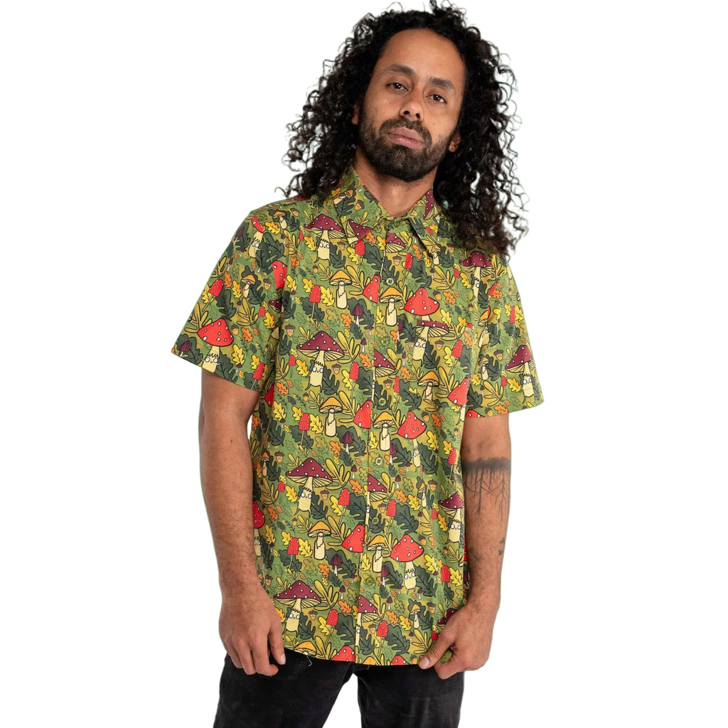 Mushroom theme patterned button up shirt, unisex.