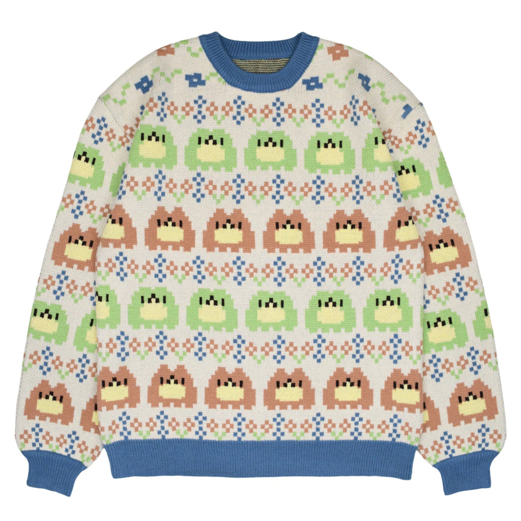 Colourful slouchy, oversized jumper featuring a fun little frog themed pattern.